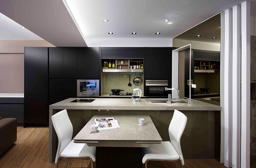 運用伸縮、隱藏設計,讓餐桌隨意變寬變長,藉以發揮更大效用,也達到節省空間的功效,實際運用包括全隱藏式餐桌、全隱藏式爐具。