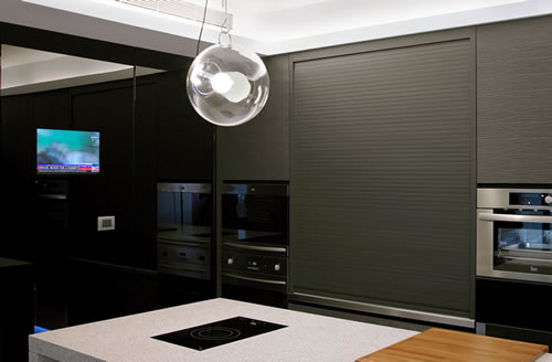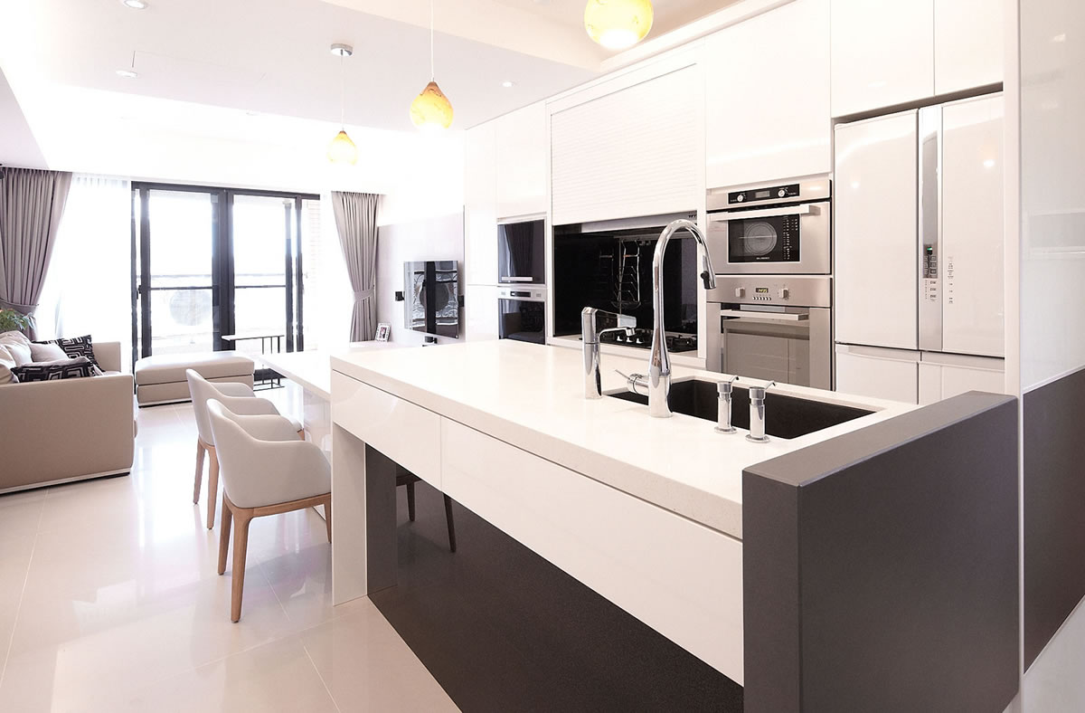 另外於櫃體表面加裝強化烤漆玻璃後,不僅視覺美觀、也更易清理。目前電動捲門提供尺寸65公分、95公分以及125公分等規格,而除了原有的捲門式外,尊櫃公司持續推陳出新,以雙門片的方式,賦予消費者多元選擇性。KⅡ客製化廚具的陳總監,一直秉持貼心的思維,持續挹注新概念與想法於廚具設計,此款專利隱形爐灶的設計,以雙門或四門開啟左右內藏,在兼顧風水與視覺整潔的層面,完整將瓦斯爐具隱藏,烹調時則將門片開啟藏納於兩旁,不佔空間且油煙更不易擴散;上方的櫃子還可規劃增加收納空間,烹調更為便利,也不再手忙腳亂、烏煙瘴氣,此新款設計自79公分至116公分均可。